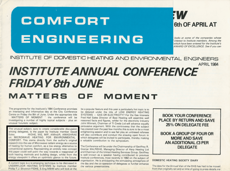 Sales D. C. (1986). Burmah Castrol Award (3rd Place): An Investigation Into the Potential of Microwave Radiant Energy as a Source of Heating for Human Comfort, Building Services Engineering Research & Technology Journal (1983).